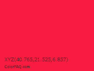 XYZ 40.765,21.525,6.857 Color is a normal red color and the nearest color is Torch Red #fd0e35. Hex code #fa1c40 and RGB value is rgb(250,28,64). In RGB color space, this color is composed of 98% red, 11% green, 25% blue, In CMYK color space, this color is composed of 0% cyan, 89% magenta, 74% yellow , 2% black , In HSL color space, this color has a hue angle of 350° , 96% saturation and 55% lightness.