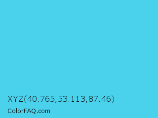 XYZ 40.765,53.113,87.46 Color is a light cyan color and the nearest color is Sea Serpent #4bc7cf. Hex code #4ad1ec and RGB value is rgb(74,209,236). In RGB color space, this color is composed of 29% red, 82% green, 93% blue, In CMYK color space, this color is composed of 69% cyan, 11% magenta, 0% yellow , 7% black , In HSL color space, this color has a hue angle of 190° , 81% saturation and 61% lightness.