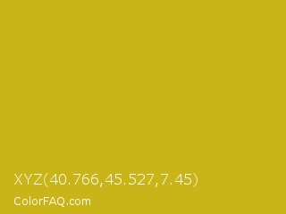 XYZ 40.766,45.527,7.45 Color is a normal yellow color and the nearest color is Gold Tips #deba13. Hex code #c9b517 and RGB value is rgb(201,181,23). In RGB color space, this color is composed of 79% red, 71% green, 9% blue, In CMYK color space, this color is composed of 0% cyan, 10% magenta, 89% yellow , 21% black , In HSL color space, this color has a hue angle of 53° , 79% saturation and 44% lightness.
