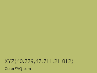 XYZ 40.779,47.711,21.812 Color is a normal yellow color and the nearest color is Wild Willow #b9c46a. Hex code #b8bd6e and RGB value is rgb(184,189,110). In RGB color space, this color is composed of 72% red, 74% green, 43% blue, In CMYK color space, this color is composed of 3% cyan, 0% magenta, 42% yellow , 26% black , In HSL color space, this color has a hue angle of 64° , 37% saturation and 59% lightness.