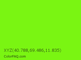 XYZ 40.788,69.486,11.835 Color is a normal green color and the nearest color is Lawn Green #7cfc00. Hex code #7af512 and RGB value is rgb(122,245,18). In RGB color space, this color is composed of 48% red, 96% green, 7% blue, In CMYK color space, this color is composed of 50% cyan, 0% magenta, 93% yellow , 4% black , In HSL color space, this color has a hue angle of 93° , 92% saturation and 52% lightness.
