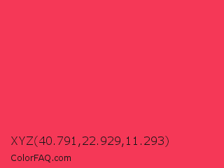 XYZ 40.791,22.929,11.293 Color is a normal red color and the nearest color is Sizzling Red #ff3855. Hex code #f53857 and RGB value is rgb(245,56,87). In RGB color space, this color is composed of 96% red, 22% green, 34% blue, In CMYK color space, this color is composed of 0% cyan, 77% magenta, 64% yellow , 4% black , In HSL color space, this color has a hue angle of 350° , 90% saturation and 59% lightness.