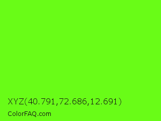 XYZ 40.791,72.686,12.691 Color is a normal green color and the nearest color is Bright Green #66ff00. Hex code #69fc17 and RGB value is rgb(105,252,23). In RGB color space, this color is composed of 41% red, 99% green, 9% blue, In CMYK color space, this color is composed of 58% cyan, 0% magenta, 91% yellow , 1% black , In HSL color space, this color has a hue angle of 99° , 97% saturation and 54% lightness.
