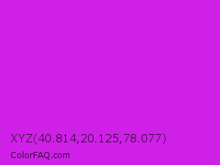 XYZ 40.814,20.125,78.077 Color is a normal magenta color and the nearest color is Vivid Mulberry #b80ce3. Hex code #cf20e8 and RGB value is rgb(207,32,232). In RGB color space, this color is composed of 81% red, 13% green, 91% blue, In CMYK color space, this color is composed of 11% cyan, 86% magenta, 0% yellow , 9% black , In HSL color space, this color has a hue angle of 293° , 81% saturation and 52% lightness.