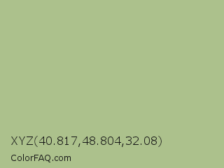 XYZ 40.817,48.804,32.08 Color is a light green color and the nearest color is Swamp Green #acb78e. Hex code #acc18c and RGB value is rgb(172,193,140). In RGB color space, this color is composed of 67% red, 76% green, 55% blue, In CMYK color space, this color is composed of 11% cyan, 0% magenta, 27% yellow , 24% black , In HSL color space, this color has a hue angle of 84° , 30% saturation and 65% lightness.