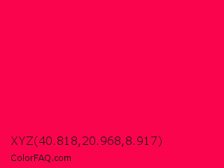 XYZ 40.818,20.968,8.917 Color is a normal rose color and the nearest color is Folly #ff004f. Hex code #fa054d and RGB value is rgb(250,5,77). In RGB color space, this color is composed of 98% red, 2% green, 30% blue, In CMYK color space, this color is composed of 0% cyan, 98% magenta, 69% yellow , 2% black , In HSL color space, this color has a hue angle of 342° , 96% saturation and 50% lightness.