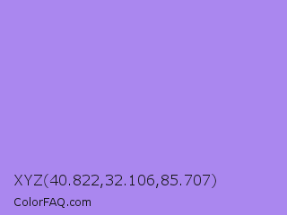 XYZ 40.822,32.106,85.707 Color is a light indigo color and the nearest color is Dull Lavender #a899e6. Hex code #aa87ef and RGB value is rgb(170,135,239). In RGB color space, this color is composed of 67% red, 53% green, 94% blue, In CMYK color space, this color is composed of 29% cyan, 44% magenta, 0% yellow , 6% black , In HSL color space, this color has a hue angle of 260° , 76% saturation and 73% lightness.