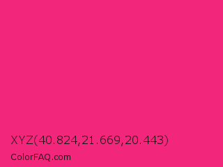 XYZ 40.824,21.669,20.443 Color is a normal rose color and the nearest color is Razzmatazz #e3256b. Hex code #f2267a and RGB value is rgb(242,38,122). In RGB color space, this color is composed of 95% red, 15% green, 48% blue, In CMYK color space, this color is composed of 0% cyan, 84% magenta, 50% yellow , 5% black , In HSL color space, this color has a hue angle of 335° , 89% saturation and 55% lightness.