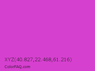 XYZ 40.827,22.468,61.216 Color is a normal magenta color and the nearest color is Steel Pink #cc33cc. Hex code #d640cf and RGB value is rgb(214,64,207). In RGB color space, this color is composed of 84% red, 25% green, 81% blue, In CMYK color space, this color is composed of 0% cyan, 70% magenta, 3% yellow , 16% black , In HSL color space, this color has a hue angle of 303° , 65% saturation and 55% lightness.