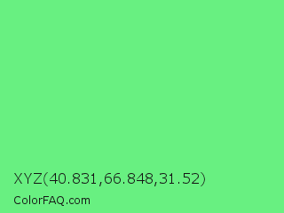 XYZ 40.831,66.848,31.52 Color is a light green color and the nearest color is Very Light Malachite Green #64e986. Hex code #68f081 and RGB value is rgb(104,240,129). In RGB color space, this color is composed of 41% red, 94% green, 51% blue, In CMYK color space, this color is composed of 57% cyan, 0% magenta, 46% yellow , 6% black , In HSL color space, this color has a hue angle of 131° , 82% saturation and 67% lightness.