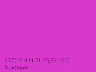 XYZ 40.834,21.75,59.173 Color is a normal magenta color and the nearest color is Steel Pink #cc33cc. Hex code #d936cc and RGB value is rgb(217,54,204). In RGB color space, this color is composed of 85% red, 21% green, 80% blue, In CMYK color space, this color is composed of 0% cyan, 75% magenta, 6% yellow , 15% black , In HSL color space, this color has a hue angle of 305° , 68% saturation and 53% lightness.