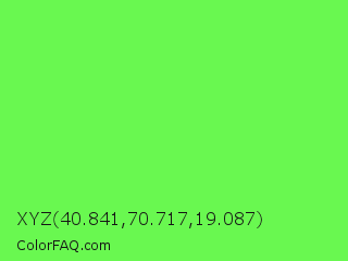 XYZ 40.841,70.717,19.087 Color is a light green color and the nearest color is Screamin Green #66ff66. Hex code #69f850 and RGB value is rgb(105,248,80). In RGB color space, this color is composed of 41% red, 97% green, 31% blue, In CMYK color space, this color is composed of 58% cyan, 0% magenta, 68% yellow , 3% black , In HSL color space, this color has a hue angle of 111° , 92% saturation and 64% lightness.