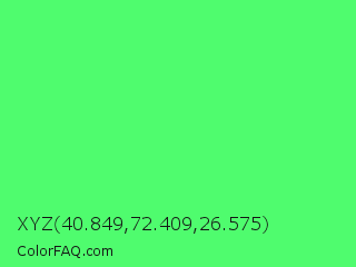 XYZ 40.849,72.409,26.575 Color is a light green color and the nearest color is Screamin Green #66ff66. Hex code #4ffc6e and RGB value is rgb(79,252,110). In RGB color space, this color is composed of 31% red, 99% green, 43% blue, In CMYK color space, this color is composed of 69% cyan, 0% magenta, 56% yellow , 1% black , In HSL color space, this color has a hue angle of 131° , 97% saturation and 65% lightness.