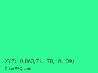 XYZ 40.863,71.178,40.439 Color is a normal green color and the nearest color is Eucalyptus #44d7a8. Hex code #2ffa96 and RGB value is rgb(47,250,150). In RGB color space, this color is composed of 18% red, 98% green, 59% blue, In CMYK color space, this color is composed of 81% cyan, 0% magenta, 40% yellow , 2% black , In HSL color space, this color has a hue angle of 150° , 95% saturation and 58% lightness.