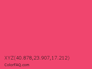 XYZ 40.878,23.907,17.212 Color is a light red color and the nearest color is Infra Red #ff496c. Hex code #f0456e and RGB value is rgb(240,69,110). In RGB color space, this color is composed of 94% red, 27% green, 43% blue, In CMYK color space, this color is composed of 0% cyan, 71% magenta, 54% yellow , 6% black , In HSL color space, this color has a hue angle of 346° , 85% saturation and 61% lightness.