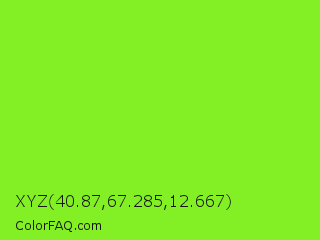 XYZ 40.87,67.285,12.667 Color is a normal green color and the nearest color is Spring Frost #87ff2a. Hex code #83f026 and RGB value is rgb(131,240,38). In RGB color space, this color is composed of 51% red, 94% green, 15% blue, In CMYK color space, this color is composed of 45% cyan, 0% magenta, 84% yellow , 6% black , In HSL color space, this color has a hue angle of 92° , 87% saturation and 55% lightness.