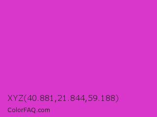 XYZ 40.881,21.844,59.188 Color is a normal magenta color and the nearest color is Steel Pink #cc33cc. Hex code #d937cc and RGB value is rgb(217,55,204). In RGB color space, this color is composed of 85% red, 22% green, 80% blue, In CMYK color space, this color is composed of 0% cyan, 75% magenta, 6% yellow , 15% black , In HSL color space, this color has a hue angle of 305° , 68% saturation and 53% lightness.