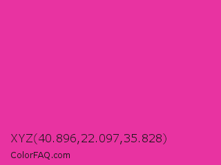 XYZ 40.896,22.097,35.828 Color is a normal magenta color and the nearest color is Frostbite #e936a7. Hex code #e833a1 and RGB value is rgb(232,51,161). In RGB color space, this color is composed of 91% red, 20% green, 63% blue, In CMYK color space, this color is composed of 0% cyan, 78% magenta, 31% yellow , 9% black , In HSL color space, this color has a hue angle of 324° , 80% saturation and 55% lightness.