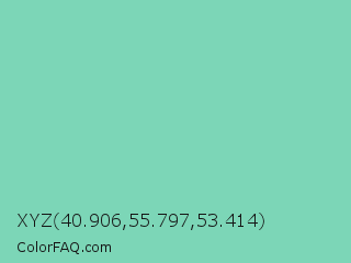 XYZ 40.906,55.797,53.414 Color is a light green color and the nearest color is Pearl Aqua #88d8c0. Hex code #7cd6b7 and RGB value is rgb(124,214,183). In RGB color space, this color is composed of 49% red, 84% green, 72% blue, In CMYK color space, this color is composed of 42% cyan, 0% magenta, 14% yellow , 16% black , In HSL color space, this color has a hue angle of 159° , 52% saturation and 66% lightness.