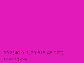 XYZ 40.911,20.615,48.277 Color is a normal magenta color and the nearest color is Shocking Pink #fc0fc0. Hex code #e31aba and RGB value is rgb(227,26,186). In RGB color space, this color is composed of 89% red, 10% green, 73% blue, In CMYK color space, this color is composed of 0% cyan, 89% magenta, 18% yellow , 11% black , In HSL color space, this color has a hue angle of 312° , 79% saturation and 50% lightness.