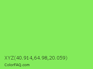 XYZ 40.914,64.98,20.059 Color is a light green color and the nearest color is Kiwi #8ee53f. Hex code #83eb5a and RGB value is rgb(131,235,90). In RGB color space, this color is composed of 51% red, 92% green, 35% blue, In CMYK color space, this color is composed of 44% cyan, 0% magenta, 62% yellow , 8% black , In HSL color space, this color has a hue angle of 103° , 78% saturation and 64% lightness.