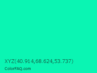 XYZ 40.914,68.624,53.737 Color is a normal green color and the nearest color is Medium Spring Green #00fa9a. Hex code #0af5b3 and RGB value is rgb(10,245,179). In RGB color space, this color is composed of 4% red, 96% green, 70% blue, In CMYK color space, this color is composed of 96% cyan, 0% magenta, 27% yellow , 4% black , In HSL color space, this color has a hue angle of 163° , 92% saturation and 50% lightness.