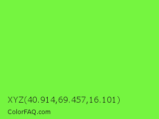 XYZ 40.914,69.457,16.101 Color is a light green color and the nearest color is Kiwi #8ee53f. Hex code #75f540 and RGB value is rgb(117,245,64). In RGB color space, this color is composed of 46% red, 96% green, 25% blue, In CMYK color space, this color is composed of 52% cyan, 0% magenta, 74% yellow , 4% black , In HSL color space, this color has a hue angle of 102° , 90% saturation and 61% lightness.