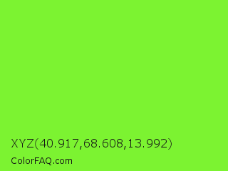 XYZ 40.917,68.608,13.992 Color is a normal green color and the nearest color is Spring Frost #87ff2a. Hex code #7cf331 and RGB value is rgb(124,243,49). In RGB color space, this color is composed of 49% red, 95% green, 19% blue, In CMYK color space, this color is composed of 49% cyan, 0% magenta, 80% yellow , 5% black , In HSL color space, this color has a hue angle of 97° , 89% saturation and 57% lightness.