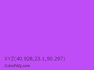 XYZ 40.928,23.1,90.297 Color is a light purple color and the nearest color is Medium Orchid #ba55d3. Hex code #bf4df7 and RGB value is rgb(191,77,247). In RGB color space, this color is composed of 75% red, 30% green, 97% blue, In CMYK color space, this color is composed of 23% cyan, 69% magenta, 0% yellow , 3% black , In HSL color space, this color has a hue angle of 280° , 91% saturation and 64% lightness.