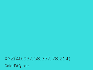 XYZ 40.937,58.357,78.214 Color is a normal cyan color and the nearest color is Turquoise #40e0d0. Hex code #38dede and RGB value is rgb(56,222,222). In RGB color space, this color is composed of 22% red, 87% green, 87% blue, In CMYK color space, this color is composed of 75% cyan, 0% magenta, 0% yellow , 13% black , In HSL color space, this color has a hue angle of 180° , 72% saturation and 55% lightness.