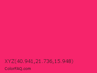 XYZ 40.941,21.736,15.948 Color is a normal rose color and the nearest color is Razzmatazz #e3256b. Hex code #f5246b and RGB value is rgb(245,36,107). In RGB color space, this color is composed of 96% red, 14% green, 42% blue, In CMYK color space, this color is composed of 0% cyan, 85% magenta, 56% yellow , 4% black , In HSL color space, this color has a hue angle of 340° , 91% saturation and 55% lightness.