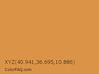 XYZ 40.941,36.695,10.886 Color is a normal orange color and the nearest color is Tigers Eye #e08d3c. Hex code #db9447 and RGB value is rgb(219,148,71). In RGB color space, this color is composed of 86% red, 58% green, 28% blue, In CMYK color space, this color is composed of 0% cyan, 32% magenta, 68% yellow , 14% black , In HSL color space, this color has a hue angle of 31° , 67% saturation and 57% lightness.