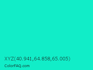 XYZ 40.941,64.858,65.005 Color is a normal cyan color and the nearest color is Bright Turquoise #08e8de. Hex code #11edc8 and RGB value is rgb(17,237,200). In RGB color space, this color is composed of 7% red, 93% green, 78% blue, In CMYK color space, this color is composed of 93% cyan, 0% magenta, 16% yellow , 7% black , In HSL color space, this color has a hue angle of 170° , 87% saturation and 50% lightness.