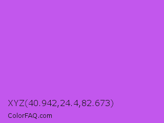 XYZ 40.942,24.4,82.673 Color is a light purple color and the nearest color is Medium Orchid #ba55d3. Hex code #c257ed and RGB value is rgb(194,87,237). In RGB color space, this color is composed of 76% red, 34% green, 93% blue, In CMYK color space, this color is composed of 18% cyan, 63% magenta, 0% yellow , 7% black , In HSL color space, this color has a hue angle of 283° , 81% saturation and 64% lightness.
