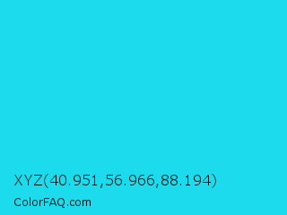 XYZ 40.951,56.966,88.194 Color is a normal cyan color and the nearest color is Bright Turquoise #08e8de. Hex code #1cdbec and RGB value is rgb(28,219,236). In RGB color space, this color is composed of 11% red, 86% green, 93% blue, In CMYK color space, this color is composed of 88% cyan, 7% magenta, 0% yellow , 7% black , In HSL color space, this color has a hue angle of 185° , 85% saturation and 52% lightness.