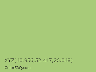 XYZ 40.956,52.417,26.048 Color is a light green color and the nearest color is Pistachio #93c572. Hex code #a8cb79 and RGB value is rgb(168,203,121). In RGB color space, this color is composed of 66% red, 80% green, 47% blue, In CMYK color space, this color is composed of 17% cyan, 0% magenta, 40% yellow , 20% black , In HSL color space, this color has a hue angle of 86° , 44% saturation and 64% lightness.