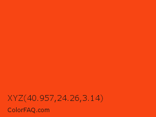 XYZ 40.957,24.26,3.14 Color is a normal red color and the nearest color is Orioles Orange #fb4f14. Hex code #f84513 and RGB value is rgb(248,69,19). In RGB color space, this color is composed of 97% red, 27% green, 7% blue, In CMYK color space, this color is composed of 0% cyan, 72% magenta, 92% yellow , 3% black , In HSL color space, this color has a hue angle of 13° , 94% saturation and 52% lightness.
