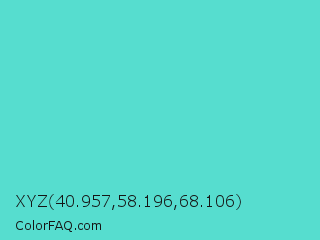 XYZ 40.957,58.196,68.106 Color is a normal cyan color and the nearest color is Medium Turquoise #48d1cc. Hex code #56ddcf and RGB value is rgb(86,221,207). In RGB color space, this color is composed of 34% red, 87% green, 81% blue, In CMYK color space, this color is composed of 61% cyan, 0% magenta, 6% yellow , 13% black , In HSL color space, this color has a hue angle of 174° , 67% saturation and 60% lightness.