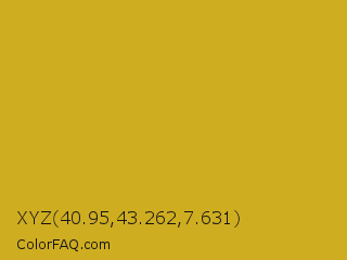 XYZ 40.95,43.262,7.631 Color is a normal yellow color and the nearest color is Hokey Pokey #c8a528. Hex code #cfad21 and RGB value is rgb(207,173,33). In RGB color space, this color is composed of 81% red, 68% green, 13% blue, In CMYK color space, this color is composed of 0% cyan, 16% magenta, 84% yellow , 19% black , In HSL color space, this color has a hue angle of 48° , 73% saturation and 47% lightness.