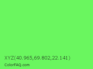 XYZ 40.965,69.802,22.141 Color is a light green color and the nearest color is Screamin Green #66ff66. Hex code #6af65f and RGB value is rgb(106,246,95). In RGB color space, this color is composed of 42% red, 96% green, 37% blue, In CMYK color space, this color is composed of 57% cyan, 0% magenta, 61% yellow , 4% black , In HSL color space, this color has a hue angle of 116° , 89% saturation and 67% lightness.