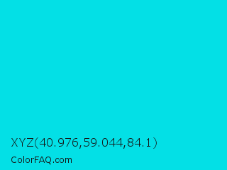 XYZ 40.976,59.044,84.1 Color is a normal cyan color and the nearest color is Bright Turquoise #08e8de. Hex code #03e0e6 and RGB value is rgb(3,224,230). In RGB color space, this color is composed of 1% red, 88% green, 90% blue, In CMYK color space, this color is composed of 99% cyan, 3% magenta, 0% yellow , 10% black , In HSL color space, this color has a hue angle of 182° , 97% saturation and 46% lightness.