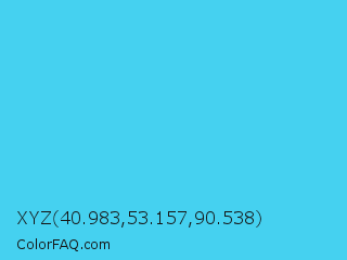 XYZ 40.983,53.157,90.538 Color is a light cyan color and the nearest color is Picton Blue #45b1e8. Hex code #45d1f0 and RGB value is rgb(69,209,240). In RGB color space, this color is composed of 27% red, 82% green, 94% blue, In CMYK color space, this color is composed of 71% cyan, 13% magenta, 0% yellow , 6% black , In HSL color space, this color has a hue angle of 191° , 85% saturation and 61% lightness.