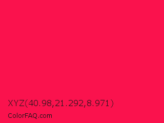 XYZ 40.98,21.292,8.971 Color is a normal red color and the nearest color is Awesome #ff2052. Hex code #fa124d and RGB value is rgb(250,18,77). In RGB color space, this color is composed of 98% red, 7% green, 30% blue, In CMYK color space, this color is composed of 0% cyan, 93% magenta, 69% yellow , 2% black , In HSL color space, this color has a hue angle of 345° , 96% saturation and 53% lightness.