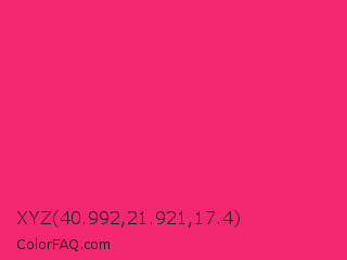 XYZ 40.992,21.921,17.4 Color is a normal rose color and the nearest color is Razzmatazz #e3256b. Hex code #f42870 and RGB value is rgb(244,40,112). In RGB color space, this color is composed of 96% red, 16% green, 44% blue, In CMYK color space, this color is composed of 0% cyan, 84% magenta, 54% yellow , 4% black , In HSL color space, this color has a hue angle of 339° , 90% saturation and 56% lightness.
