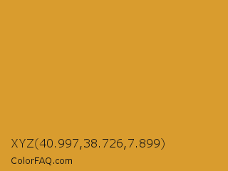 XYZ 40.997,38.726,7.899 Color is a normal orange color and the nearest color is Fire Bush #e89928. Hex code #d99c2e and RGB value is rgb(217,156,46). In RGB color space, this color is composed of 85% red, 61% green, 18% blue, In CMYK color space, this color is composed of 0% cyan, 28% magenta, 79% yellow , 15% black , In HSL color space, this color has a hue angle of 39° , 69% saturation and 52% lightness.