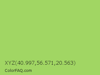 XYZ 40.997,56.571,20.563 Color is a light green color and the nearest color is Conifer #acdd4d. Hex code #a1d663 and RGB value is rgb(161,214,99). In RGB color space, this color is composed of 63% red, 84% green, 39% blue, In CMYK color space, this color is composed of 25% cyan, 0% magenta, 54% yellow , 16% black , In HSL color space, this color has a hue angle of 88° , 58% saturation and 61% lightness.