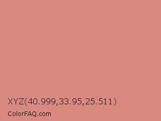 XYZ 40.999,33.95,25.511 Color is a light red color and the nearest color is New York Pink #d7837f. Hex code #d78982 and RGB value is rgb(215,137,130). In RGB color space, this color is composed of 84% red, 54% green, 51% blue, In CMYK color space, this color is composed of 0% cyan, 36% magenta, 40% yellow , 16% black , In HSL color space, this color has a hue angle of 5° , 52% saturation and 68% lightness.