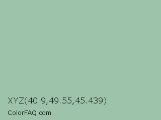 XYZ 40.9,49.55,45.439 Color is a light green color and the nearest color is Cambridge Blue #a3c1ad. Hex code #9dc4aa and RGB value is rgb(157,196,170). In RGB color space, this color is composed of 62% red, 77% green, 67% blue, In CMYK color space, this color is composed of 20% cyan, 0% magenta, 13% yellow , 23% black , In HSL color space, this color has a hue angle of 140° , 25% saturation and 69% lightness.