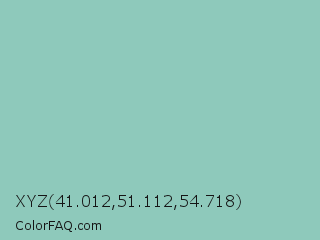 XYZ 41.012,51.112,54.718 Color is a light cyan color and the nearest color is Shadow Green #9ac2b8. Hex code #8ec9bb and RGB value is rgb(142,201,187). In RGB color space, this color is composed of 56% red, 79% green, 73% blue, In CMYK color space, this color is composed of 29% cyan, 0% magenta, 7% yellow , 21% black , In HSL color space, this color has a hue angle of 166° , 35% saturation and 67% lightness.