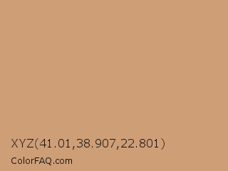 XYZ 41.01,38.907,22.801 Color is a light orange color and the nearest color is Antique Brass #cd9575. Hex code #ce9e77 and RGB value is rgb(206,158,119). In RGB color space, this color is composed of 81% red, 62% green, 47% blue, In CMYK color space, this color is composed of 0% cyan, 23% magenta, 42% yellow , 19% black , In HSL color space, this color has a hue angle of 27° , 47% saturation and 64% lightness.